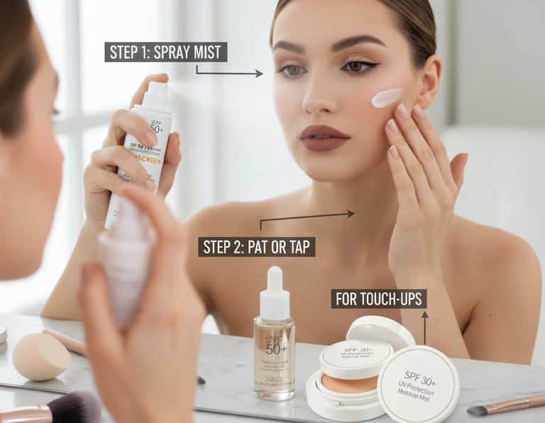 Use a lightweight SPF spray or mist: Hold it about 6–8 inches from your face and spray evenly.
